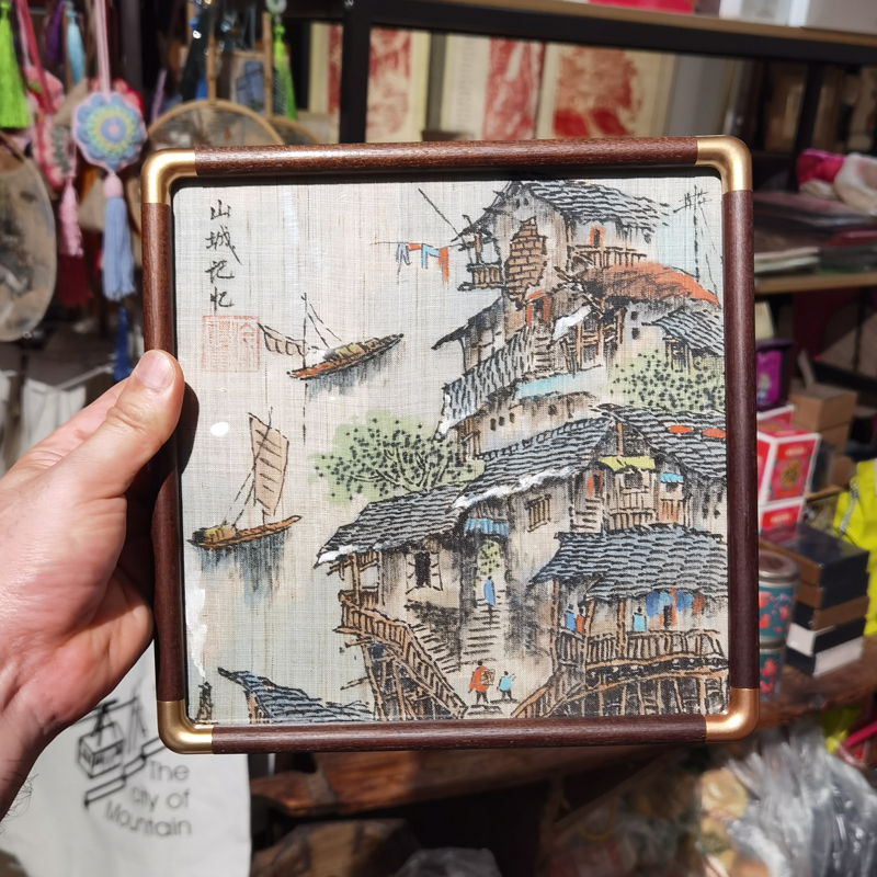 夏布手绘吊脚楼胡桃木拼金属框每件独品